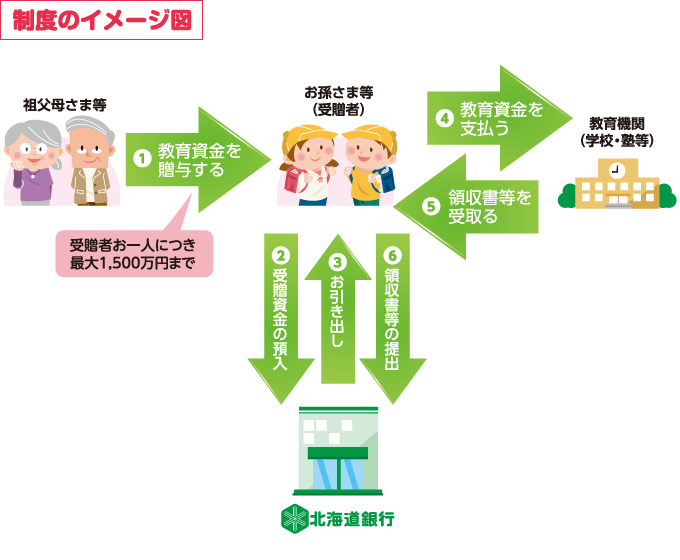 2013年4月1日(月)から2026年3月31日(火)までの間に、30歳未満の方(以下「受贈者」という)が、教育資金(下記「非課税措置の対象となる教育資金の範囲」を参照)に充てるため、金融機関等との一定の契約に基づき、受贈者の直系尊属(祖父母など)から書面による贈与により取得した金銭を銀行等に預入をした場合には、1,500万円までの金額に相当する部分の価額については、金融機関等の営業所等を経由して教育資金非課税申告書を提出することにより贈与税が非課税となります。